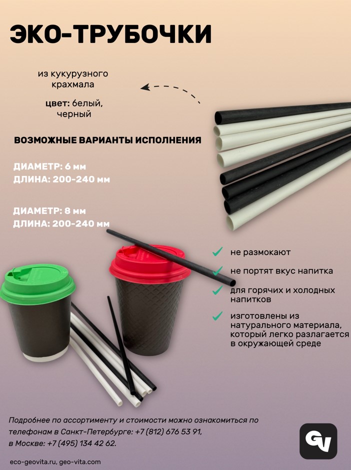 Ещё одна деталь, без которой не обходится ни одно кафе и ни один осенний напиток – эко-трубочки из кукурузного крахмала. Они прочные, не влияют на вкус и подходят для горячих напитков. После использования разлагаются в природе — без следа и вреда.