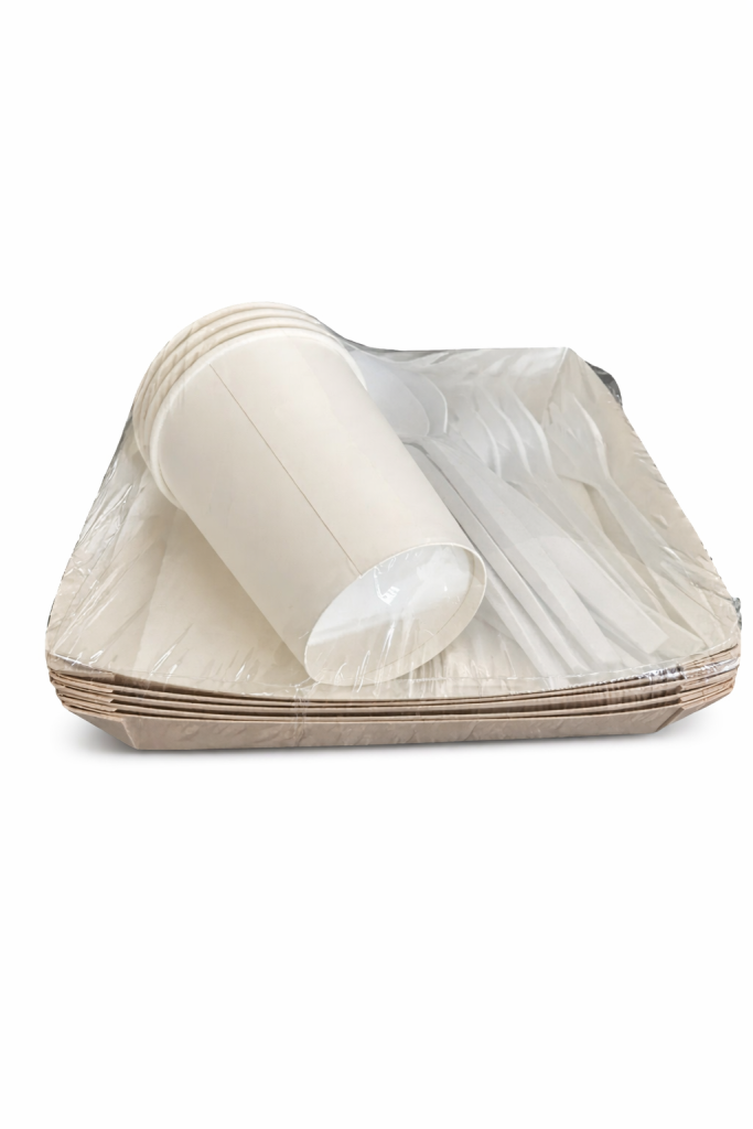 4 лотка с ламинацией, 4 однослойных стакана и 4 по штуки биоразлагаемых приборов.