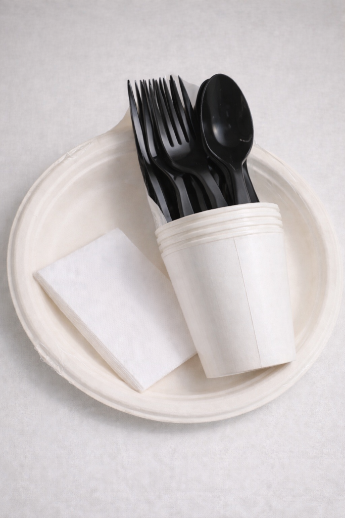 4 лотка из сахарного тростника, 4 однослойных стакана, 4 салфетки и 4 по штуки приборов из полистирола.