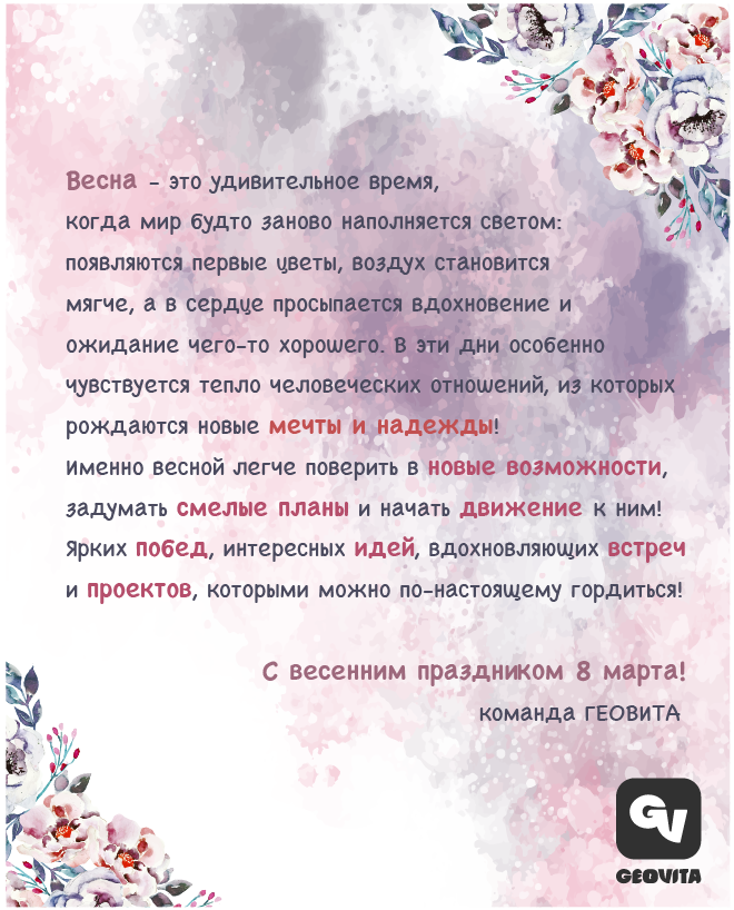 От всей команды ГЕОВИТА поздравляем наших партнёров, клиентов и всех, с кем нас связывает работа и сотрудничество, с этим прекрасным весенним праздником.